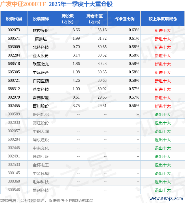 从基金规模来看,广发中证2000ETF基金2025年一季度公布的基金规模为0.52亿元灵菲配资,较上一期规模5512.81万元变化了-270.75万元,环比变化了-4.91%。该基金最新一期资产配置为:股票占净值比98.73%,债券占净值比0.01%,现金占净值比1.33%。从基金持仓来看,该基金当季前十大股票仓位达5.84%,第一大重仓股为软控股份(002073),持仓占比为0.63%。