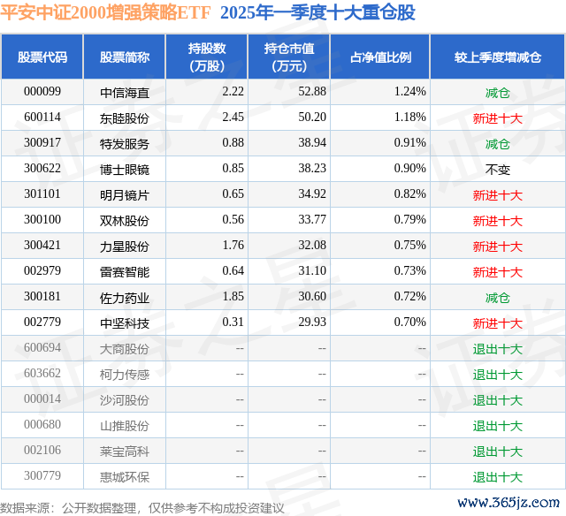 从基金规模来看涨8,平安中证2000增强策略ETF基金2025年一季度公布的基金规模为0.43亿元,较上一期规模7811.04万元变化了-3555.18万元,环比变化了-45.51%。该基金最新一期资产配置为:股票占净值比92.47%,无债券类资产,现金占净值比6.13%。从基金持仓来看,该基金当季前十大股票仓位达8.74%,第一大重仓股为中信海直(000099),持仓占比为1.24%。